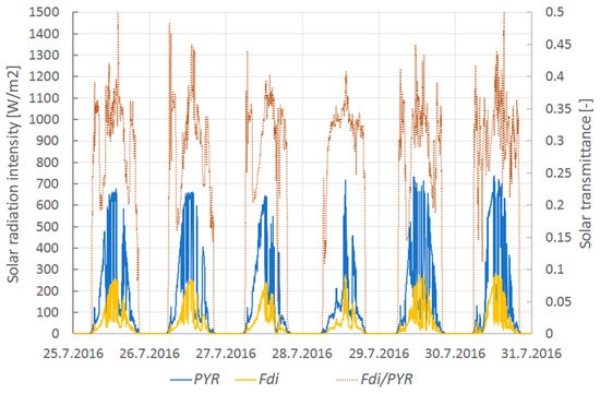 The second method is based on outdoor experiments applying the comparative in-situ measurement approach. The authors assembled their own measurement apparatus for this task taken fundamental specification of ASTM E1084-86(2015) into account. This test method also allows measurement of solar transmittance at angles other than normal incidence. In addition, it is particularly applicable to the measurement of transmittance of inhomogeneous, fiber reinforced, patterned, or corrugated materials since the transmittance is averaged over a large area. Two pyranometers were mounted in square boxes and a third additional device was left exposed to outdoor conditions (Figure 3). The equipment was used to determine the total solar transmittance of the TIM. The experimental setup and a diagram of it are illustrated in Figure 3 conducted at the AdMaS research centre at Brno University of Technology (longitude 16°34′, latitude 49°14′, altitude 297.23 m). All results were taken during measurements where maximum sun height above horizon has been achieved during midday at 60°, which corresponds to the 30° incline from normal incidence angle. The results presented in Figure 4 are from two different measurement days representing two different sky conditions: overcast (Figure 4a) and almost clear (Figure 4b). Here, the ratio between solar intensity of opened air pyranometer sensor and those placed in both test boxes behind the measured component is presented corresponding to the total solar transmittance value (TIM + G4/PYR and G4/PYR), as well as the courses of solar intensities monitored respectively (TIM + G4, PYR ad G4). Finally, the ratio of solar intensity of TIM combined with G4 and sample G4 (TIM + G4/G4) represents a value for TIM separately. For almost clear sunny period Figure 4b, results are strongly cloud sensitive. This aspect is observed by continuous solar transmittance varying. On the other hand, very stable progressions are observed during cloud conditions (Figure 4a). For both test periods, higher the maximum level of solar intensity is, slightly higher the total solar transmittance obtained. All of the results were finally evaluated as tabular values (Table 5). As can be seen, good agreement was achieved between both of the applied methods. A spectral transmittance of around 0.75 was obtained for pure transparent honeycomb insulation in the laboratory, whilst its total outdoor value reached up to 0.80. This deviation can be caused by final test setup positioning. Further improvements could be achieved, however already obtained results can demonstrate an applicable and adequate level. Regarding the real outdoor in-situ measurements using the sun as the source, this approach specifically aimed to obtain real outdoor values.