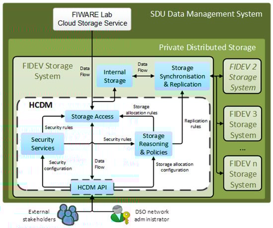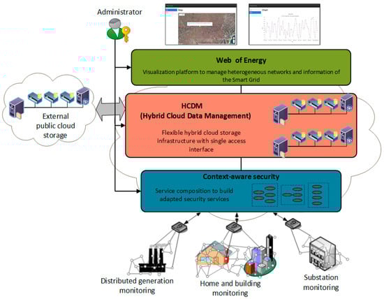 - Hybrid cloud data management (HCDM) (Section 3). A flexible and scalable data management system for the smart grid. It is a distributed storage system based on a dynamic configuration of the nodes that collect and store data from the smart grid at distribution level. Additionally, it includes a data orchestrator for hybrid cloud storage in smart grid environments, which is a system that decides in which data storage system the resources and data collected by the smart grid should be placed [].