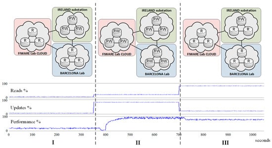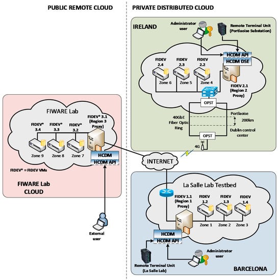 For the sake of testing this approach, two trials were deployed in Ireland and Barcelona (Figure 2). They present a flexible data management system that allows maintaining the data generated by ESB (the Electricity Supply Board is a state owned electricity company operating in the Republic of Ireland) locally replicated and in the hybrid cloud as well (through FIWARE Lab when needed). It shows a novel ICT infrastructure for DSOs, providing automatic data collection at substations, critical data exchange and redundancy among substations, and flexible but secure movement of smart grid data and applications from local systems to the cloud. To test these features, different regions (Ireland, Barcelona, and Public Cloud) and several zones inside each of those regions have been defined. The data replication scheme of the data storage distributed system [] can be configured by the DSO network administrator to automatically distribute the data among regions and zones and assure its high availability and low latency access, in a dynamic cloud or fog computing services deployment basis.