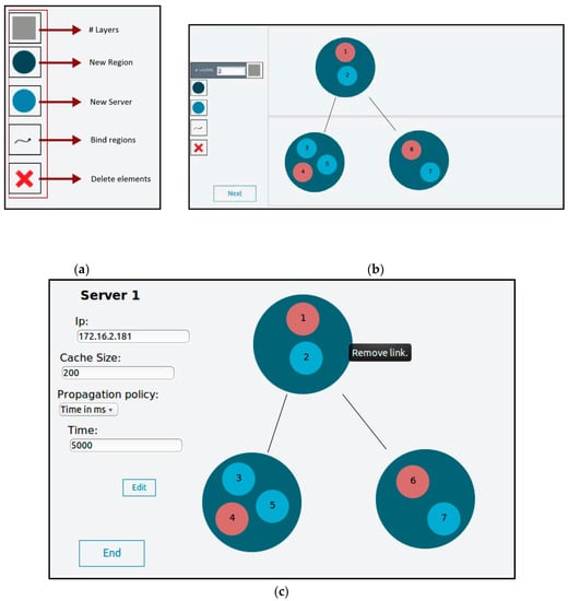 In order to assist on the configuration and deployment of the distributed storage system over the smart utility facilities, a web-based graphical interface has been developed as depicted in Figure 4. Through this intuitive interface, it is possible to: (1) configure the distributed storage architecture (i.e., define the number of replication layers [], regions and servers that will be taken into account for the replication logic); (2) deploy the configured system to the smart grid facilities; and (3) monitor the status of the replication process and servers. The nodes collect data from different energy resources and are in charge of replicating these data among them in order to provide data redundancy and spread the information over the smart grid, so it can become rapidly available at different points of the network. Replication layers [] define the different levels of replication, being the servers on the top layer the ones that have the freshest data since they are updated more frequently [,]. Additionally, in order to determine the scope of the data replication process, different regions can be defined inside any layer. Hence, each server can be associated to any of the defined regions. Therefore, depending on the layer that the region is placed, different data refresh times can be configured. Note that using this epidemic replication approach [] the system scalability is improved and the data availability can be adjusted according to the application demands.
