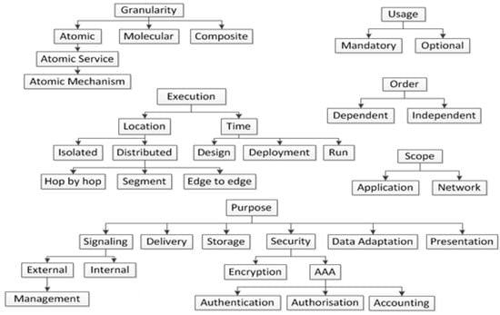 In this regard, the authors have extended the work conducted in [] and present a new taxonomy of services (Figure 5) for AMI security in this paper. This taxonomy classifies services into six different generic parameters: “Granularity”, “Execution”, “Scope” (application/network), “Purpose”, “Usage” (mandatory/optional) and “Order” (dependent/independent), following the criteria selected in [] and defining new sub-criteria based on the general and security requirements of a smart metering management [,,,]. All these criteria can be applied generically to any smart grid service, although the options shown in Figure 5 for “Purpose” criteria are limited to smart metering. Afterwards, the selected modules for smart metering are classified according to this taxonomy (Table 3).