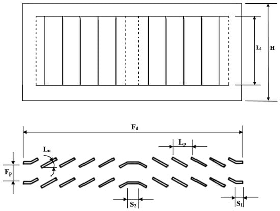 A total of 36 heat exchanger configurations having three different flow depths , three different fin pitches and four different louver angles were considered for numerical analysis. The fin thickness and louver pitch value for all computational models were kept constant at and respectively. The fin pitch parameter is varied by changing the thickness of three-dimensional computational domain. The analysis was performed under conditions mimicking the actual test environment. The inlet air temperature was fixed at 21 °C, and since the tube-side thermal resistance needs to be minimized in order to accurately predict the air-side heat transfer coefficient, the tube temperature was kept constant at across the flow depth. Geometric dimensions for the heat exchanger models used for analysis are mentioned in detail, in Figure 1 and Table 3.