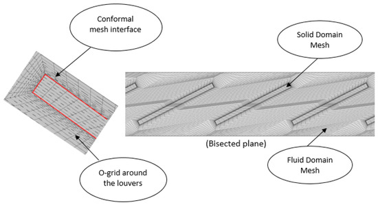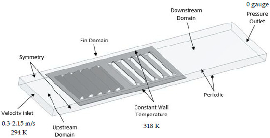 Velocity inlet and pressure outlet boundary conditions were applied to the air inlet and outlet. Frontal air velocity value of 0.3–2.15 m/s corresponding to the louver pitch based Reynolds number of 30–500 was applied at the air inlet boundary while zero gauge pressure was kept at the pressure outlet boundary. The air domain was divided into three sub-domains; upstream, downstream and fin domain. The width of the upstream domain and downstream domain was kept fixed at 5 mm (four times fin pitch) and 15 mm (ten times fin pitch), respectively. This was to ensure that there were zero gradients of temperature, pressure and velocity at the inlet and outlet boundaries. The pressure data was calculated by creating planes at the start and end of the fin in order to only consider the pressure drop within the louvered fin geometry. Only half of the fin was modeled considering the number of simulations and computational cost. Symmetry boundary condition was applied to the transverse faces of upstream and downstream air domains. Symmetry boundary conditions are used when the physical geometry of interest and the expected pattern of the flow/thermal solution have mirror symmetry, which helps to reduce the extent of a computational model to a symmetric subsection of the overall physical system. ANSYS Fluent 16 assumes a zero flux of all quantities across a symmetry boundary. A no-slip boundary condition was imposed on all solid walls and a constant tube wall temperature of 318 K was applied at the transverse face of the fin domain. A periodic boundary condition was used for longitudinal faces of air domain in order to mimic fully developed flow and heat transfer. Periodic boundary condition allows creating a non-conformal periodic boundary interface. This helps to predict heat transfer in periodically repeating geometries, such as compact heat exchangers, by including only a single periodic module for analysis. The detailed schematic of the boundary conditions is shown in Figure 2.