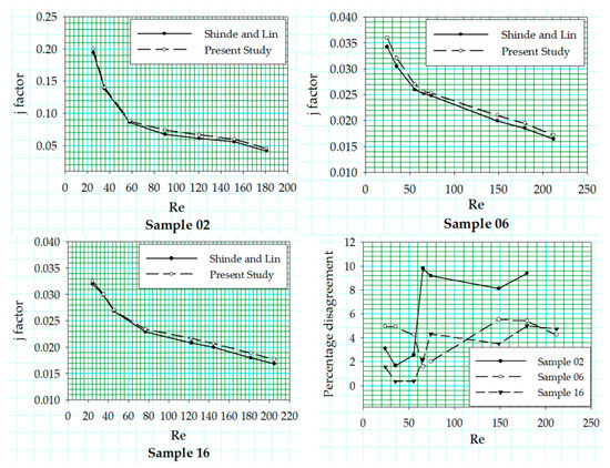 Three randomly selected louvered fin configurations from the experimental study performed by Shinde and Lin [27] were modeled and analyzed computationally. Samples 2 and 16 have the fin thickness value of while sample has the fin thickness value of 0.08 mm. The results were compared and reported in terms of nondimensionalized parameters, shown in Figure 5, and the two were found to be in good agreement. The j factor against low values of a louver pitch based Reynolds number that is agrees very well with the experimental data, but a small offset is noticed for the higher range of Reynolds number.