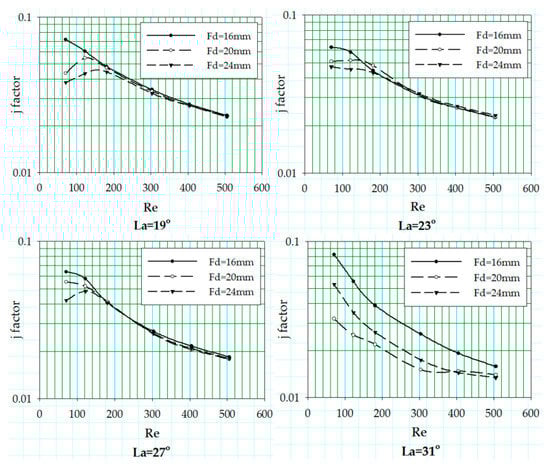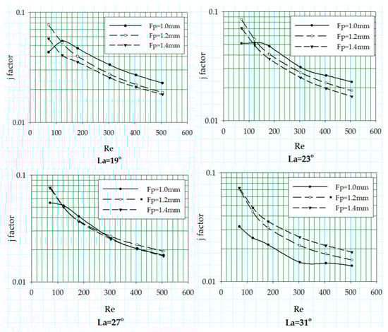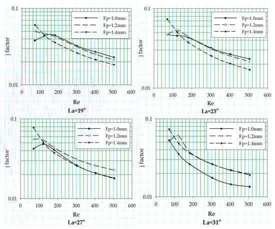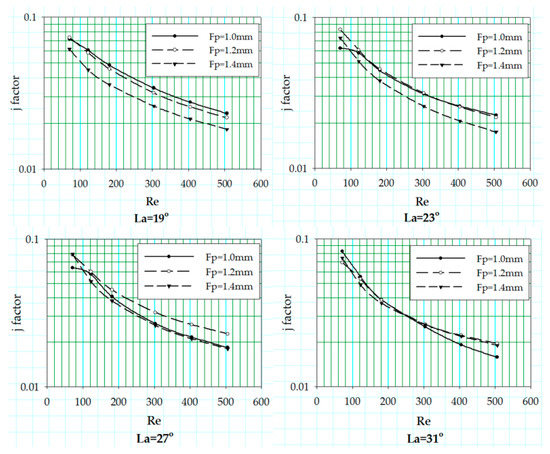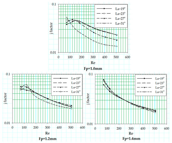 The change in the heat transfer coefficient in terms of Colburn j factor is reported for the variation in louver angle associated with three different fin pitch values at fixed flow depth of 24 mm. The trend of the j factor curves against the Reynolds number of aforementioned geometric sets is shown in Figure 13.