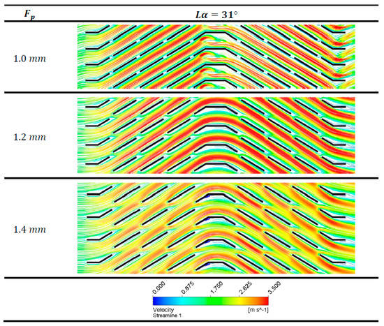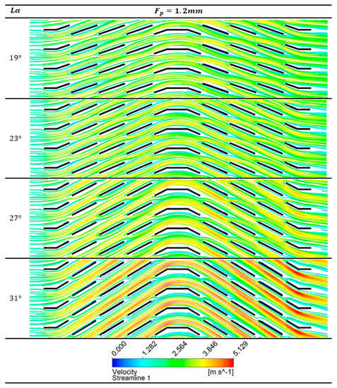 The critical Reynolds number peak becomes more clear in Figure 7 and Figure 8, with flow depth of 20 and 24 mm, and this critical Reynolds number fall off disappears with the increase in louver angle. The critical Reynolds number is only seen for geometries with fin pitch of 1.0 and 1.2 mm. The underlying phenomenon for this j factor fall off is explained using Figure 10, which shows the change in boundary layer generation around the louvers for fin geometry with fin pitch and flow depth value of 1 mm and 24 mm, respectively, at four louver angles. It can be seen for louver angle 19°, 23° and 27° that the downstream louver is not placed in the wake of the upstream louver. This allows re-initialization of the boundary layer around the downstream louvers. In contrast, this re-initialization of boundary layer cannot be seen for louver angle of 31°, as the downstream louvers fall in the wake of the upstream louver. For geometry with fin pitch 1.0 mm and louver angle of 31°, the j factor curve shows a vast offset with other two curves associated with fin pitch values of 1.2 and 1.4 mm. This offset can be explained by the consequential deterioration of thermal performance caused by louver alignment, prohibiting the boundary layer re-initialization phenomenon. Figure 8 shows an interrelation between the flow depth and the fin pitch of the louver configuration when it comes to critical Reynolds number. The fall-off in the j factor curves also appears for the fin pitch 1.2 mm along with fin pitch value of 1.0 mm for the geometries with flow depth 24 mm. This may be because of change in flow pattern due to an increase in number of louvers.