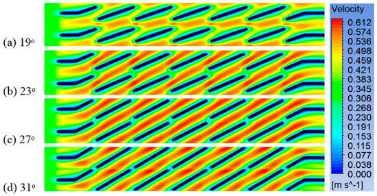 Velocity contours for geometry with Fd = 24 mm and Fp = 1.0 mm at different louver angles.