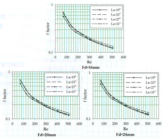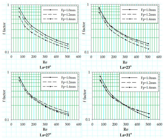 The Fanning friction factor values for different fin pitches are plotted as a function of Reynolds number at different louver angles ranging from 19 to 31° in Figure 11, while the flow depth is set constant at 20 mm. The results show that there is no change in f factor curves pattern associated with the change in fin pitch values, but it depicts a drop in the f factor values as the fin pitch values increase from 1.0 to 1.4 mm.