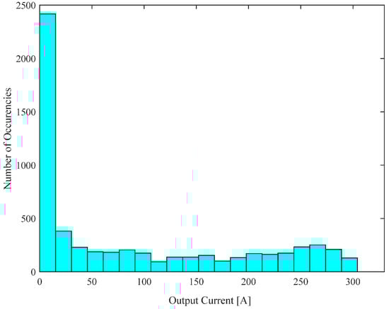 The prediction performances of the considered models were investigated by means of several simulation tests carried out using data from the De Nittis Power Plant in the Apulia Region, Italy (latitude , longitude ). Data were relative to a single photovoltaic plant, organized with eight cabins with two inverters each. The output current was used as the variable to be predicted. The value was sampled at the source with a 5-min sample interval, and it was collected from 6:00 a.m. to 10:55 p.m., resulting in 204 samples per day. The used data stream comes from a single inverter of a single cabin, and it is relative to the year 2012. In order to provide a statistical characterization of the handled time series, whose samples are measured in Amperes, we have computed the first four statistical moments of the whole 2012 dataset, whose histogram is also reported in Figure 1: mean 85.1291; variance ; skewness 0.8151; kurtosis 2.1082. Successively, the whole time series has been normalized linearly between zero and one in order to cope with the numerical requirements of learning algorithms, especially for neural network models.