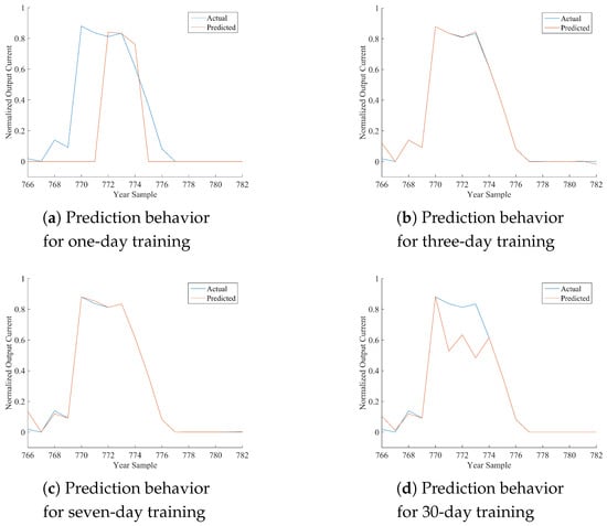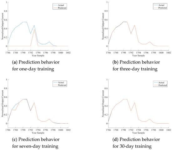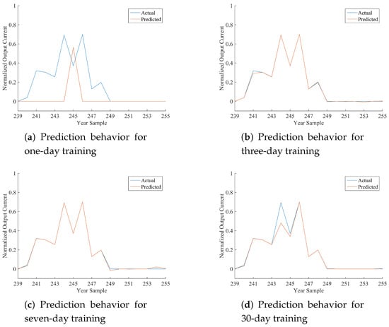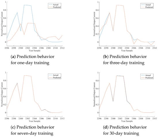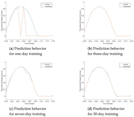 The numerical results for each tested day are reported in Table 1, Table 2, Table 3, Table 4, Table 5, Table 6, Table 7, Table 8, Table 9, Table 10, Table 11 and Table 12, where the performance of the best model is marked in bold font. As per the following discussion, being HONFIS the model that assures the best performance in most of the situations, the graphical illustration of the actual time series (blue line) and the one predicted by HONFIS (red line), over the four training conditions, is reported in Figure 2, Figure 3, Figure 4, Figure 5, Figure 6, Figure 7, Figure 8, Figure 9, Figure 10, Figure 11, Figure 12 and Figure 13, respectively. In the x-axis is reported the cumulative index of samples of the considered day, starting from Index 1 for the first sample of 1 January 2012 (which is a leap year) and considering 17 samples per day. The output current reported in the y-axis is a dimensionless value between zero and one, as the whole dataset has been normalized before the model processing. Some negative values may occur because of possible numerical issues of a trained model when its performance is inadequate.