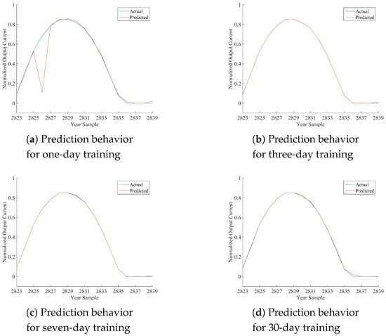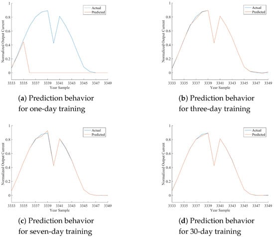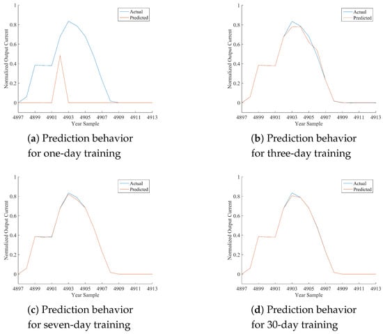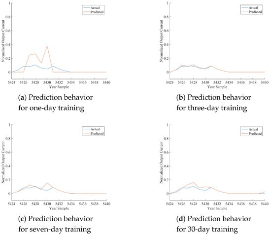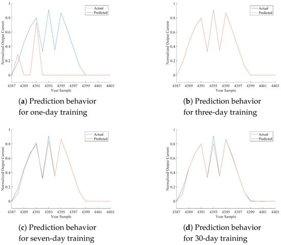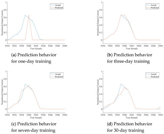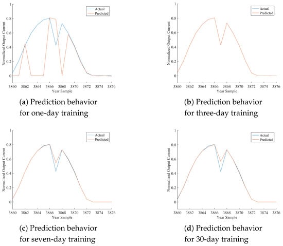 A similar discussion can be made, with smaller variability, for the three-day training sets. It has to be noted that we have inserted the one-day and three-day training sets mainly to show the sensitivity of the models to different training conditions. The results for seven-day training sets are much more stable for all of the algorithms and the days. The results for 30-day training sets are stable as well, but the sequences are much longer; thus, if the days are variable in terms of meteorological conditions, the model has a worse performance because the training process is more difficult. Training sets longer than 30 days were also considered in some preliminary tests, and the results confirm such a trend for which the performance decreases progressively as much as the length of the training set increases.