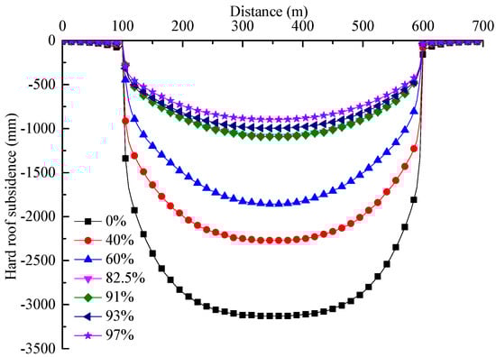 - After mining the entire working panel, the maximum subsidence of the hard roof decreases with increasing roof-controlled backfill ratio. When the roof-controlled backfill ratios were 0%, 40%, 60%, 82.5%, 91%, 93% and 97%, the maximum subsidences of the roof were 3130, 2270, 1860, 1180, 1090, 996 and 898 mm, respectively. This indicated that the backfill materials did control the roof subsidence.