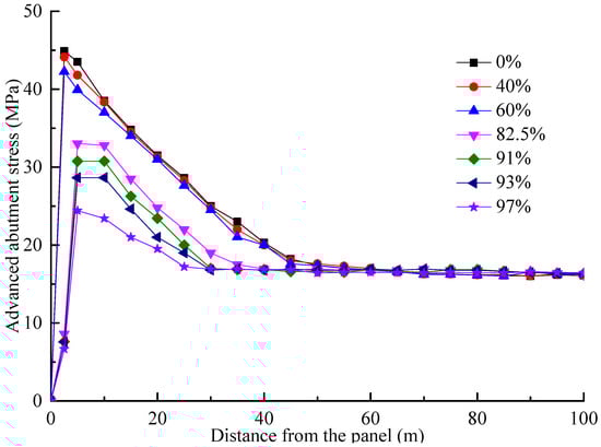 - In the case of a varying roof-controlled backfill ratio (82.5%, 91%, 93% and 97%), the advanced abutment stresses on working panels decrease, along with their range of influence. When the ratio reaches 97%, the peak stress decreases from 44.9 MPa while using a mining caving method, to 24.4 MPa: the range of influence of the stresses decreases from 45 m to 25 m, which also significantly reduces the extent of stress concentration in front of the working panel.