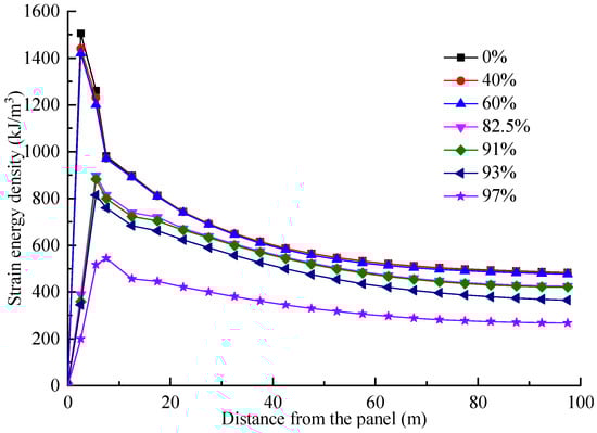 - When the roof-controlled backfill ratios are 82.5%, 91% and 93%, the strain energy in front of the working panel significantly decreases and the larger the roof-controlled backfill ratio, the more significant the decrease; however, when the roof-controlled backfill ratios are 91% and 93%, the strain energy in front of the working panel decreases slightly and the peak strain energies are 882 kJ/m3 and 814 kJ/m3, which are similar to that at a backfill ratio of 82.5%.