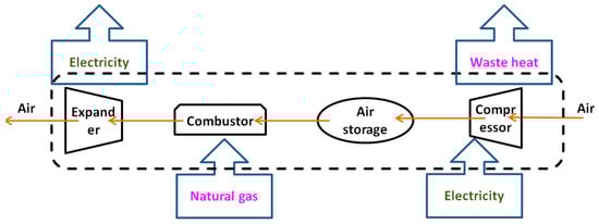 Existing literature has studied the thermodynamics of conventional CAES [10,11,12,13,14,15], A-CAES [16,17,18,19,20,21,22], and combustion of hydrogen instead of natural gas to fuel conventional CAES [23]. Moreover, alternative advanced CAES designs have also been studied such as isothermal CAES, CAES paired with cogeneration of heat and power, CAES with humidification, and trigeneration CAES systems [24,25,26,27,28,29].