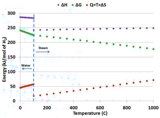 For the electrolysis process itself, the total energy requirement (), the change in entropy (), and the electricity demand (change in the Gibbs free energy, ) are determined by Equations (A90)–(A92) as a function of the reaction temperature ().