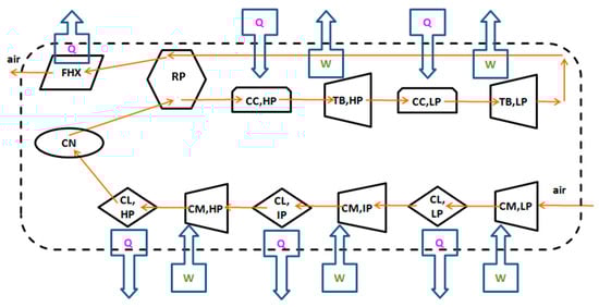 Schematic of the conventional CAES system. The compression train (CM) is composed of three stages: low-, intermediate-, and high-pressure (LP, IP, and HP). The expansion train (TB) is made of high- and low-pressure stages (HP and LP). “Q” and “W” represent heat and work interactions between the system and the surroundings. The air leaving the cavern is preheated in the recuperator by the hot air leaving the low pressure turbine (internal heat transfer). “0” indicates ambient condition. CL, CN, CC, RP, and FHX stand for the cooler, cavern, combustor, recuperator, and final exhaust heat exchanger.