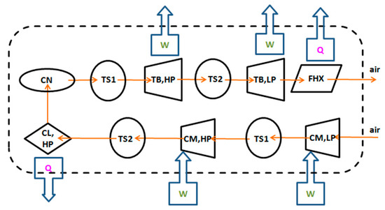 The expansion train of A-CAES is made up of two stages (HP and LP). The withdrawn compressed air is heated in TS1 and TS2 before expanding and generating electricity (combustors are eliminated). No recuperator is considered. This is owing to the low discharge temperature of the LP expander. The discharge stream is cooled to the ambient temperature in the final exhaust heat exchanger (FHX). TS1 absorbs heat from the air leaving the low-pressure compressor and provides heat to the compressed air entering the high-pressure expander. TS2 interacts with the high-pressure compressor and the low-pressure expander. Refer to Appendix A for more details.