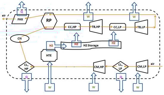 Finally, the total heat load of the electrolyzer () is determined by Equation (A97). This variable is used to find the discharge temperature of the electrolyzer () through the trial and error procedure explained earlier.