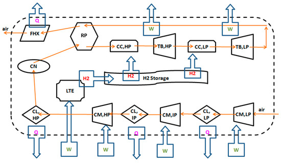 Equations (A23)–(A27) remain applicable for quantifying the changes in the mass and temperature of the compressed air remaining in the cavern during discharge. Similar to the conventional CAES system, the inlet temperatures of the low-pressure and high-pressure turbines ( and ) are preset. Therefore, Equations (A28)–(A30) quantify the expansion work and the instantaneous exit temperature of the turbines (expanders). The heat load of the low-pressure and high-pressure combustors are determined by applying Equations (A31), (A33) and (A75). Finally, the mass and exergy of the hydrogen fuel needed are calculated via Equations (A76) and (A77).
