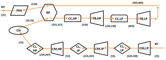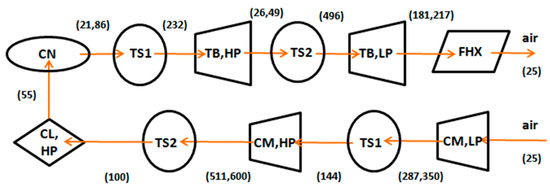 Thermal storage units (TS1 and TS2) are constrained to have a constant discharge temperature over the charging period. The constant exit temperature of TS2 (succeeding the HP compressor) is preset (). The constant exit temperature of TS1 (preceding the HP compressor) is, however, dictated by the value chosen for maximum discharge temperature of the HP compressor (). Solving the system of equations composed of Equations (A51)–(A53) finds the fixed inlet temperature of the high-pressure compressor () that limits its maximum exit temperature to the preset value of . Note that is equal to .