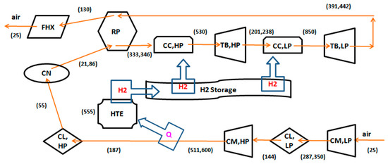 The compressor of the CAES-HTE system simulated has two stages (similar to A-CAES). A cooler (heat exchanger) lowers the temperature of the exhaust stream of the LP compressor to a fixed value before entering the high-pressure compressor. The maximum discharge temperature of the high-pressure compressor is a design parameter and is preset, similar to A-CAES. The discharge of the HP compressor is fed into a high-temperature electrolyzer. Its heat is used to boil water, to heat up the generated steam to the constant temperature of the electrolyzer (), and to provide the heating energy required for the electrolysis process.