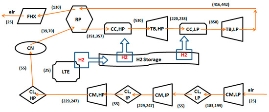 The simulated CAES-LTE system (Figure 6) has a similar configuration as the CAES-HTE system, with the difference that a low-temperature electrolyzer (LTE) is used instead of a HTE. Moreover, a three-stage compression train is used, similar to conventional CAES. This is because there is no need to produce high-temperature heat. Increasing the number of compression stages in CAES-LTE reduces the compression work compared to CAES-HTE.