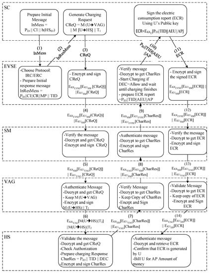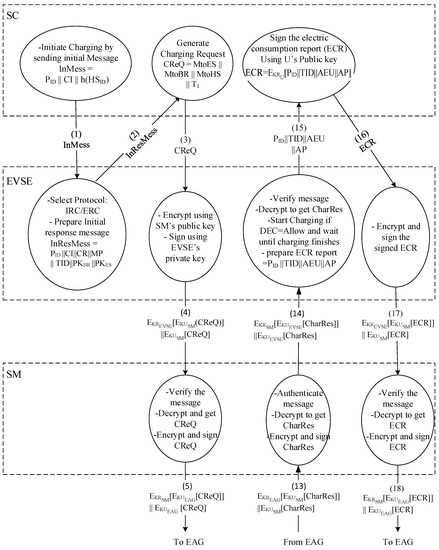 - The ECR message is sent to the VAG in a similar way as explained before (encrypting it with the public key of the receiver and then signing it with the private key of the sender).EVSE → SM = EKREVSE[EKUSM[ECR]] || EKUSM[ECR]SM → VAG = EKRSM[EKUVAG[ECR]] || EKUVAG[ECR]