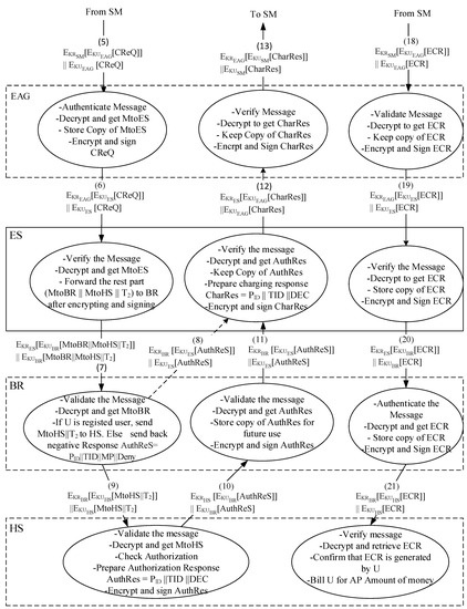 - Upon receiving the charging response from the ES, the EAG verifies that the response comes from the ES and that the message is not changed in transit. The EAG decrypts the message using its private key. Then the EAG sends the message to the SM after encrypting it using the public key of the SM and signing it using its private key. The EAG also keeps a copy of the response for future use. This is described as:CharRes = PID || TID || Allow or PID || TID || Deny.EAG → SM := EKREAG[EKUSM[CharRes]] || EKUSM[CharRes].