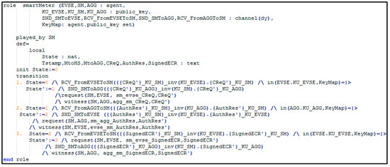 In HLPSL, the action of each agent participating in the protocol is represented by a module similar to methods in programming languages called roles. Roles describe the initial parameters the participant can use, its initial state, and the sequence of actions performed by the agent. For instance, the HLPSL code in Figure 10 shows the role representing the SM in our protocol. As we can see from the figure, the role takes initial parameters such as a set of public keys (the public key of EVSE, aggregator and its own public key), the agents that will be communicating with it, the channel over which it communicates …etc. The set of actions performed by a role and the transitions it makes are also specified. In our HLPSL code, we defined roles for each of the entities such as User, EVSE, SM, Aggregators, Broker and Suppliers. However, due to space constraint, they are not shown here. After defining each basic role, we need to describe a composed role that specifies how roles interact with one another to form sessions of the protocol.
