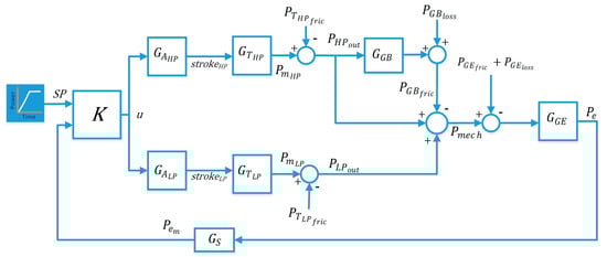- The nonlinearities introduced by the look-up tables were replaced by constant gains defined as the ratio between the maximum inlet steam mass flow and the maximum stroke valve: