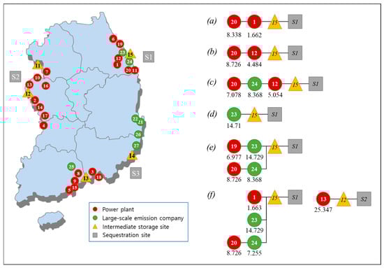 Scenario (c) replaces some of the GHG emission reductions in the power sector with CCS technology. It is necessary to install a CO2 capturing facility at Tongyang Cement & Energy Corp., in addition to considering the Samcheock and Bukpyeong power plants considered in scenario (b). The most economical approach for this scenario is to construct a CCS network by capturing 7 million, 5 million, and 8.4 million tons of CO2 from the three sites, respectively, which is then transport through intermediate storage site 5 and stored at the Samcheok sequestration site, which is located deep in the sea. Toward this end, the total cost of the CCS network is estimated as $3.6441 million (pipeline construction cost, $0.38 million; pipeline operation cost, $0.0699 million; and CO2 capture and storage installation cost, $3.1966 million).