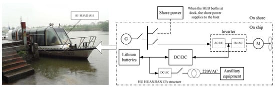 Figure 1. When the HEB berths at the dock, the boat is supplied by the shore power. The hybrid system is mainly composed of a diesel generator set, lithium iron phosphate power batteries, a bi-directional DC/DC converter, inverter including AC/DC rectifier and DC/AC converter, a transformer, auxiliary equipment, and propulsion motor, etc.