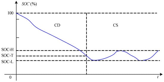 Figure 2. During the CD period, the SOC of the power battery continues to drop to SOC-T. In the CS period, the SOC is kept in the range of SOC-L and SOC-H.