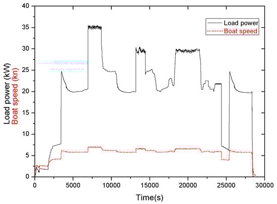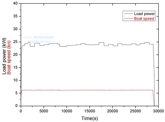 Figure 6. The boat makes several round-trips during 8 h per day in the river, and the average speed of the boat is about 6.27 Kn. It can be seen that the HEB is cruising with constant speed, and the load power is from 23 to 25 kW. The power battery SOC curve and the generator work curve are shown in