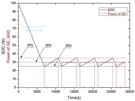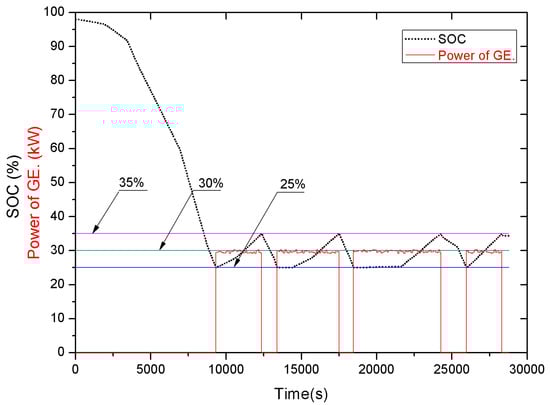 Figure 6, it is obvious that, during the CD period, the whole power system is only supplied by the power battery, while the generator set is in a stop state, and during the CS period, the SOC drops to SOC-L (25%) at about 9300 s and the generator starts working to drive the propulsion motor and at the same time to charge the battery. At about 12,300 s, the SOC rises to SOC-H (35%) and the generator stops running. In the whole CS period, the work state of generator is decided based on the control strategy.