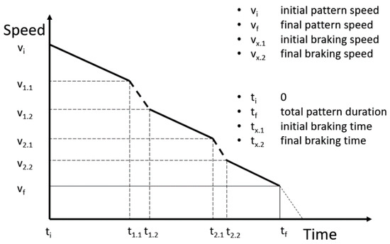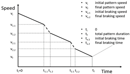 The driver starts decelerating in inertia and corrects the speed with the brakes so that stopping is not finally necessary, as Figure 1 shows. It may appear next to a traffic light that is initially red that becomes green before the vehicle arrives at the stopping point. The continuous lines show the periods in which inertia is used, and the dashed lines show those in which the driver uses the brakes. The parameters show the relevant speed values along the pattern such as the initial speed (), braking start (), or the speed at which the driver retains inertia (). represents the final speed of the pattern and the point at which the driver accelerates again.