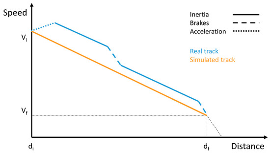 Figure 4 shows a schematic representation of the ideal and real tracks. While the ideal curve shows how deceleration would be subject to a single inertia period, the real curve, after an acceleration period, alternates inertia with the use of the brakes, which implies harder decelerations. Both curves start and end at the same point.