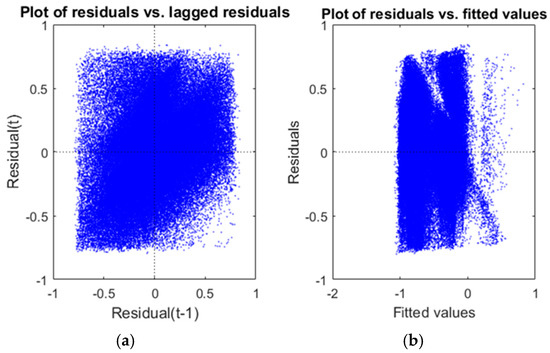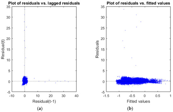 Scatter plot of residuals. (a) Residuals versus lagged residuals. (b) Residuals versus fitted values.