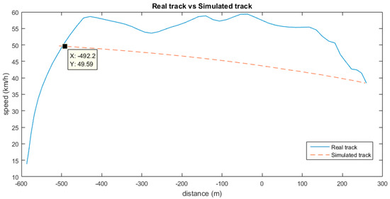 Now we have the data to apply the linear model, starting with Step 1 again. Therefore, we go back, calculating the ideal points of the simulated track. When we reach a point at which the ideal curve cuts the real one (ideal speed is higher than real speed), then we have the ideal starting point of inertia, as shown in Figure 11. In that point, the position and speed are the same for both the real and ideal tracks. Therefore, we now know the domain of samples that we have to analyse. We know that the consumption in the simulated track is null, as the driver would be applying inertia. In order to quantify the inefficiency of the real track, we only need to calculate the total consumption of the bus in the real track. We have the instant consumption of each sample in , and the elapsed time between every two samples in , so for samples we just need to apply: