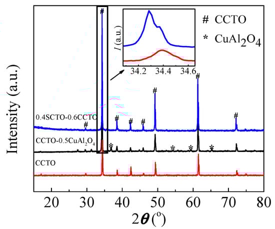 XRD patterns of undoped CCTO ceramics, CaCu3Ti4O12-0.5CuAl2O4 composite and 0.4CaCu3Ti4O12-0.6CaCu3Ti4O12 composite is shown in Figure 1. Obviously, all of the samples exhibit one main perovskite phase, which is cubic perovskite-related-structure (space group Im3) CCTO, by comparison with the standard Powder Diffraction File Database [JCPDS-05-0566 #75-2188]. Besides, the in-situ formed phase of spinel CuAl2O4 can be detected in CaCu3Ti4O12-0.5CuAl2O4 samples. However, in 0.4SCTO-0.6CCTO composites, no second phase is detected. Since the radius of Sr2+ is larger than that of Ca2+, the main peak of XRD patterns moves towards lower angles in 0.4SCTO-0.6CCTO composites, which could also be verified in the inset of Figure 1.