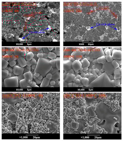 In this paper, for CCTO-CuAl2O4 composites sintered for 4 h, the second phase of CuAlO4 is uniformly located among the CCTO grains, which can effectively consume the Cu-rich phase and obstruct the contact of CCTO grains. The pinning effect of CuAlO4 affects the mass transfer process and thus impedes the abnormal grain growth of CCTO grains. For CCTO-CuAl2O4 composites sintered for 20 h, Figure 2b shows that partial CuAlO4 is swallowed by the CCTO grains, leading to reduced CuAlO4 located intergranularly and a weakened pining effect. In 0.4SCTO-0.6CCTO composites, it is obvious that the grain size of 0.4SCTO-0.6CCTO composites are sharply decreased compared to pure CCTO samples in Figure 2e,f. The pining effect in 0.4SCTO-0.6CCTO is slightly different from that in CCTO-CuAl2O4 composites. No nominal second phase exists in the composites since only one main phase of CCTO is detected in XRD. However, the interfaces in 0.4SCTO-0.6CCTO composites consist of interfaces between SCTO/SCTO, SCTO/CCTO, and CCTO/CCTO, which can effectively hinder grain growth. Moreover, under the transport action of SrTiO3 [18,19], partial Cu-rich phase transfers from grain boundary into grain, thus decreasing the formation of Cu-rich phase at the grain boundary and impeding abnormal grain growth.
