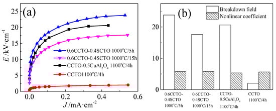 The current density (J)-breakdown field (E) characteristics of CCTO, CCTO-0.5CuAl2O4, and 0.4SCTO-0.6CCTO ceramics is given in Figure 3a. The current range is from 0.5 to 500 μA. The breakdown field is defined as the electric field when the current density is around 0.6 mA·cm−2. Results of the breakdown field and the nonlinear coefficient are shown in Figure 3b. It can be found that the CCTO-0.5CuAl2O4 and 0.4SCTO-0.6CCTO samples show an extremely high breakdown electric field Eb of about 20 kV·cm−1, which is almost 10 times of former works in both pure CCTO ceramics [3,20] and CCTO-based composite ceramics [9]. The breakdown field of 0.4SCTO-0.6CCTO samples sintering at 1000 °C for 5 h even reaches 23.8 kV·cm−1 and that of CCTO-0.5CuAl2O4 samples also achieves 21 kV·cm−1, which are the highest values ever reported. As the SEM images show, the pining effect of the second phase can effectively reduce the grain size, which can lead to the enhancement of the breakdown field. In addition, the consumption of Cu-rich by CuAlO2 in CCTO-0.5CuAl2O4 and the transport action of SrTiO3 in 0.4SCTO-0.6CCTO result in even higher Eb. The nonlinear coefficients are calculated in the current range of 50–500 μA. It is clearly shown in Figure 3b that nonlinear coefficients do not decrease with enhanced breakdown fields, maintaining excellent nonlinear properties.