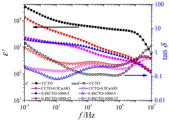 Permittivity and dielectric loss at room temperature of CCTO, CCTO-0.5CuAl2O4, and 0.4SCTO-0.6CCTO ceramics are presented in Figure 4. It can be seen that permittivity of both CCTO-0.5CuAl2O4 and 0.4SCTO-0.6CCTO ceramics are much smaller than that of pure CCTO ceramics but still reach more than 1000. Nevertheless, compared to high dielectric loss of more than 2 in CCTO ceramics at 0.1 Hz, the stable permittivity at low frequency (less than 10 Hz) in CCTO-0.5CuAl2O4 and 0.4SCTO-0.6CCTO suppress the dielectric loss effectively, resulting in the low dielectric loss of about 0.1 even at 0.1 Hz. A similar phenomenon is also observed in the CCTO/MgTiO3 [9] and CCTO/CaTiO3 [21] composite ceramics, and it has been attributed to the missing charge carriers. In addition, according to the formula of stored energy U = (εEb2)/2, the maximum U calculated for CCTO-0.5 CuAl2O4 and 0.4SCTO-0.6CCTO samples are correspondingly 44.1 and 50.9 kJ·m−3 in this work, which is a great improvement over that of CCTO ceramics of 2–7 kJ·m−3 in previous works [1,3,20,21].