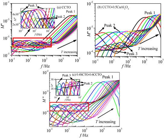 Figure 6. Frequency dependence of the electric modulus in the temperature range of 153–433 K for undoped CCTO ceramics (a), CaCu3Ti4O12/CuAl2O4 composite (b) and 0.4SCTO-0.6CCTO (c).