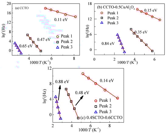 Peak 1 in Figure 5 is commonly considered as the intrinsic bulk or grain relaxation in CCTO ceramics [6]. Activation energy of Peak 1 is 0.11 eV for CCTO ceramics, while this value is about 0.13 eV for the CCTO-0.5CuAl2O4 composite and 0.14 eV for the 0.4SCTO-0.6CCTO composite. In the CCTO-0.5CuAl2O4 composite, since the radius of Al3+ (0.535 Å) is close to that of Ti4+ (0.605 Å), Al3+ tends to substitute Ti4+ to form the AlTi′. As the grains of CCTO are n-type semiconducting, the carrier concentration will be reduced according to the substitution. Additionally, in recent work, Al3+ concentration is much higher than its solid solubility limit in CCTO [23]. Thus, interstitial Ali··· can be generated from Al3+ filling in the gaps of unit cell, which are caused by Cu-deficiency. Therefore, charge carriers in n-type semiconducting grains are partially compensated, and defect structures can be restrained, leading to a slight increase in the intrinsic energy level. The decline of the dielectric response in Figure 4 at high frequency can also be explained by this inhibition effect. In the 0.4SCTO-0.6CCTO composites, since cation-O bonds do not need much energy [24], oxygen vacancies can be considered a reasonable source for electron formation. However, the solid solution effect of Sr2+ in CCTO and Ca2+ in SCTO has an inhibitory effect on the intrinsic oxygen vacancy defects. After Ca2+ or Sr2+ is involved in solid solution, the generation of oxygen vacancy is difficult to achieve, thus increasing the intrinsic activation energy [25].