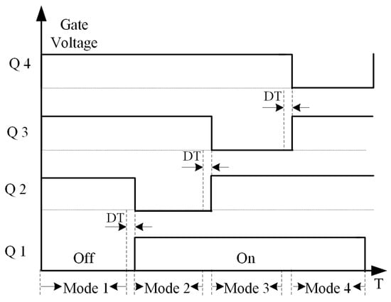 In the following, a four-cell battery pack is taken as an example to explain the MSIBC, which is comprised of three inductors and four power MOSFETs. There are four control signals for the MOSFETs, as shown in Figure 2, resulting in four working modes, as shown in Figure 3. A short dead-time (DT) is inserted in each mode to avoid short circuits.