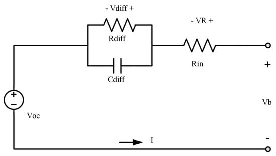 The goal of the balancing operation is to equalize the cells’ SOCs. The measured battery terminal voltage is only a rough indicator of the SOC as the terminal voltage consists of three components; namely, open circuit voltage (OCV), polarization voltage, and voltage drop across internal resistances [9,25,35]. Of these, only the OCV directly reflects the SOC. To find the OCV, a commonly-used equivalent circuit model (ECM) of a battery is adopted, as shown in Figure 5. In this ECM, and I represent the battery terminal voltage and current, respectively. The resistance describes the instantaneous voltage drop. A parallel branch with a resistance and a capacitance represents the dynamics of diffusion. When the sample rate of the voltage is high, the diffusion effect of can be ignored [9]. Therefore, the OCV can be approximately calculated by: