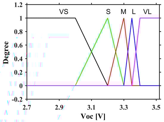 A membership function (MF) defines how each point of the variables in the input space is mapped to a degree of membership between 0 and 1. There are two fuzzy input variables, cell OCV () and cell OCV difference (), and one fuzzy output variable, inductor current (). The OCV difference of cell is defined as: