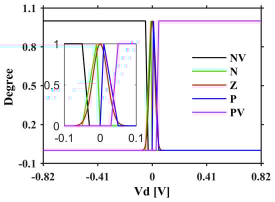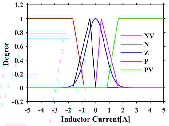 The membership selection is decided by the characteristics of the battery pack and the requirement of the balancing system. A LiFePO4 battery is used as an example to explain the membership design. The OCV of the LiFePO4 battery is described by five linguistic variables, i.e., VS (very small), S (small), M (medium), L (large), and VL (very large), in triangular and trapezoidal forms, as shown in Figure 7. Since the LiFePO4 battery has a very flat voltage around 3.3 V, the MFs concentrate on 3.3 V. The OCV difference and the inductor current are described by the same five linguistic variables as the OCV, i.e., NV (negative large), N (negative), Z (around zero), P (positive), and PV (positive large), as shown in Figure 8 and Figure 9, respectively. The range covers all the possible cell voltage differences in the pack. However, in most cases, these difference values are between −0.1 V and 0.1 V, which is shown in the enlarged figure. In the control process, the output current should be near zero when the OCV difference is near zero to improve the efficiency and stability, and the output current should increase quickly when the OCV difference is above the threshold to obtain a fast balancing speed. Since the sum of the MFs at one point is not required to be one in the FL system [38], the use of Gaussian MF can achieve better performance than the use of the triangle MF; thus Gaussian MF is applied to the linguistic variable Z for the MFs of and . It can make the output inductor current drop quickly to near zero when is less than 20 mV, reducing the balancing loss and the chance of divergence.